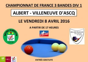 ALBERT - The big surprise in Group A of the French team competition three cushion plays a home match against Villeneuve d'Ascq on the final day of the regular competition. The match will be played this Friday (8 April) from 17.00.