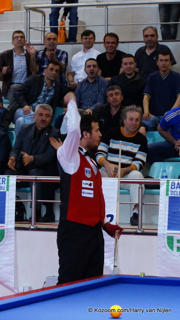 Tayfun Tasdemir, trailing against Dion Nelin most of the match, also got away with a point: 40-40 in 20 innings. Lütfi Cenet then beat Tonny Carlsen, who had a 30-22 lead but then stopped scoring altogether (40-30 to Cenet in 20), and Bahcelievler was certain to win their group, to the delight of the spectators.