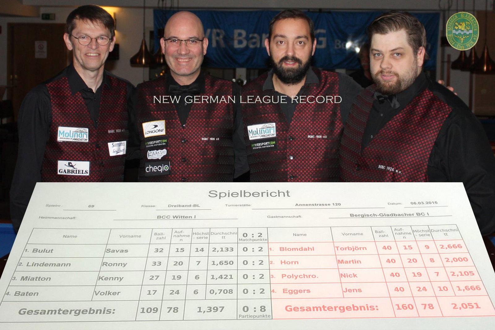 Bergisch Gladbach was the champion last season three points ahead of the teams BC Munich and BC Magdeburg. The first national title for the team was celebrated with a new German record team average 2.051, achieved with Torbjörn Blomdahl, Nikos Polychronopoulos, Martin Horn and Jens Eggers as the base team. The best match was played by Marco Zanetti with 40 points in seven innings (5.714). Dick Jaspers was the best over the whole season with 2.264 in sixteen matches.
