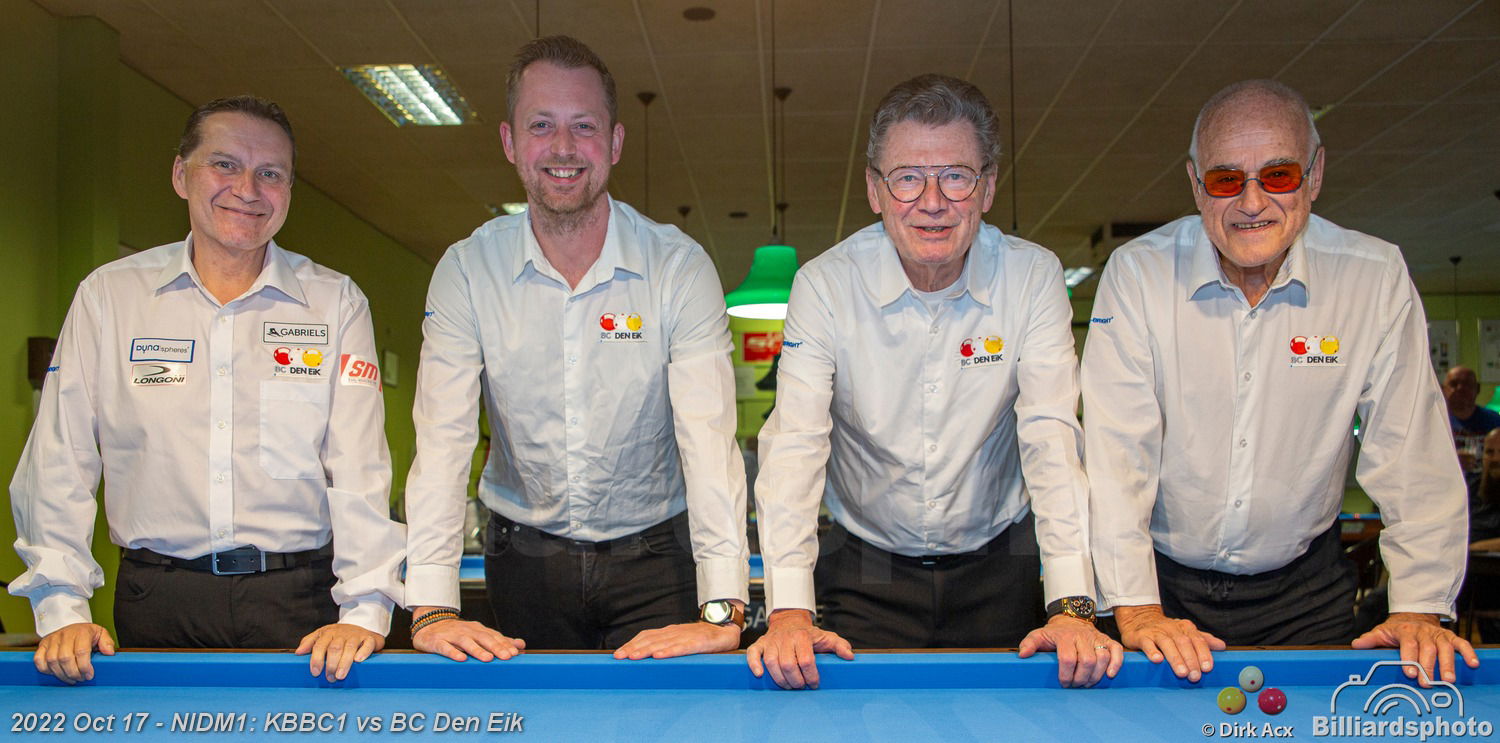At BC Den Eik versus Brugse, Merckx won against Van Acker and Davy van Havere against Henk Blauwblomme (40-35 in 46). The other two games ended in a draw: Bart Leys against Richard Bitalis in 38 innings, Koen Saver against Ludo Dielis in 53. Mister 100 won the home match against Billiard Promotion 5-3, despite Peter Ceulemans' loss against Jean Paul de Bruijn 40-39 in 25. Ceulemans had to score three times in the equalizer, but missed the last point. Jerry Hermans and Bart Ceulemans defeated Marc Janssen and Peter Meersman in 30 and 35 innings. Kurt Ceulemans took the full win for the team against Danny Geysen with the equaliser in the last inning: 40-40 in 35.