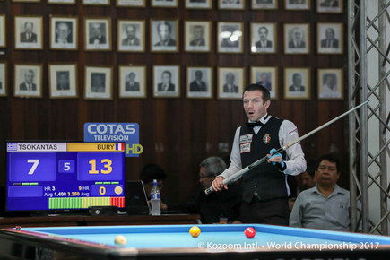 Torbjörn Blomdahl could leave Guido Sacco behind with a run of 8 in the 17th inning and then grabbed the win at 40-27 in 26. Sung-Won Choi overwhelmed the American Pedro Piedrabuena (40-15 in 18), Frédéric Caudron defeated David Pennör 40-27 in 27 and Jérémy Bury closed the day with a victory over Greek Dionisis Tsokantas: 40-20 in 23.