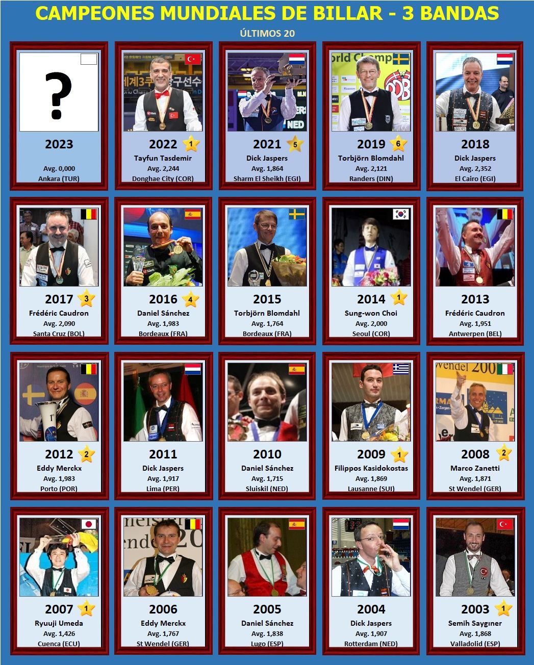 In the run-up to the World championship in Ankara, Peruvian billiards fan Roberto Molina from Portoviejo, who visualises wonderful schedules and statistics, has pictured the world champions from 2003 onwards. He starts with Semih Sayginer in 2003 and ends with Tayfun Tasdemir in 2022. That can be supplemented by Marco Zanetti's victory in 2002, making it a collage of the last 20 champions.