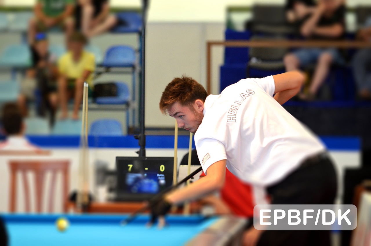 The round was the quarter-finals. Cwikla had already two victories under his belt. He demolished Marco Peroco (ITA) 8:0 and Timofey Sereda (BLR) 8:2. There was not much resistance he had to face so far. Same goes for Koukiadakis. He took down Aykin Burcu (TNC) 8:0 and then went on and contended Federico Amendola (ITA) 8:4. Cwikla was definitely favored to win that match. But from the very beginning, Koukiadakis proved that he was not intending to become easy prey for the defending Champion. To the contrary, the Greek provided a fierce fight to the Champion and never let Cwikla get any advantage on the scoreboard. After eight racks, the match was all square at 4:4. Then Koukiadakis managed to get a small lead with 6:4 over Cwikla. That was probably the turning point in the match. At 7:5, Cwikla’s nerves let him down and Koukadakis went on to triumph against the Polish, winning 8:5. This victory takes Koukiadakis into the semi-final tomorrow and promises him his first medal at European Championships. He will encounter Russian all-star Maksim Dudanets (RUS) who remained victorious over Mark Magi (EST) 8:4 today. The other semi-final in the Under 19’s will be played between Patrick Hofmann (GER) and Daniel Maciol (POL). Hofmann has a shot to pick up his third title this week.