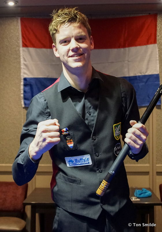 The champion took his fifth national title, his first in the 71/2. "I felt a little suspense, because the title meant for me participation at the European championship, this year in Brandenburg. I certainly wanted to go there, for my first year as a senior. Now I can play the 71/2 and 47/2 at the EC. In addition, the Dutch championship one cushion is played next month. There I can also qualify for the European championship.''