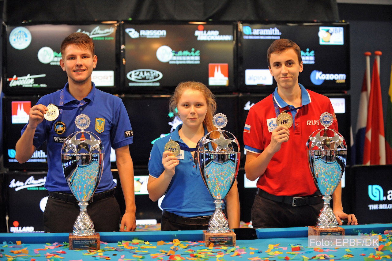 The Gold Medals at the Dynamic Billard European Championships Youth in the 10-ball individuals have just been awarded. Kristina Tkach (RUS), Fedor Gorst (RUS) and Vitaliy Patsura (UKR) have taken the titlest.