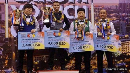 HOCHIMINH CITY - The Vietnamese player Quyet Chien Tran has conquered the Asian three cushion title in HoChiMinh. With that victory, Tran climbed to the world's top three, which is led by Dick Jaspers and Frédéric Caudron. In the final of the Asian championship, Tran beat young Korean Myung-Woo Cho 40-38 in 19 innings. On the stage were also Dong-Koong Kang and Nguyen Thung Hau Do. The championship was played in the Nguyen Du stadium in HoChiMinh.