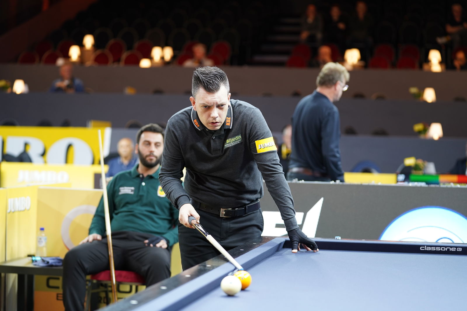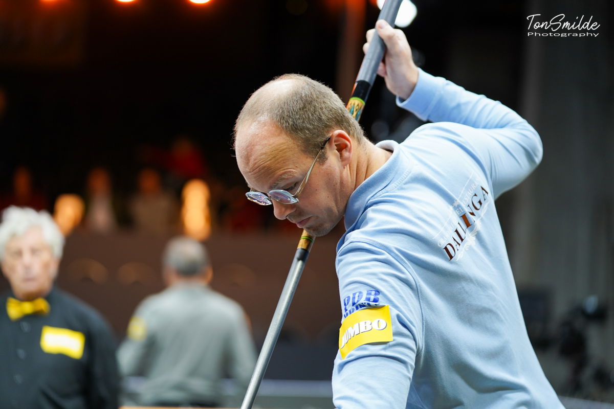 For two of the Dutch survivors this day, it was an all or nothing match on the late evening. Kay de Zwart, living in suspense because of his wife's emerging delivery, started his match against Ali Ibraimov with 3, 8 and 4 and continued with 10 zeros. He finished in the 21st inning, Ibraimov needed five in the equalizer, but missed his last. Harrie van de Ven balanced on the brink against Dimitrios Seleventas. The Dutchman ran into trouble after losing a 28-16 lead. The Greek youngster had to score twice in the equalizer for a draw. He was already cheering for his last, but the referee ruled otherwise: no carom and thus 30-29 in 32.