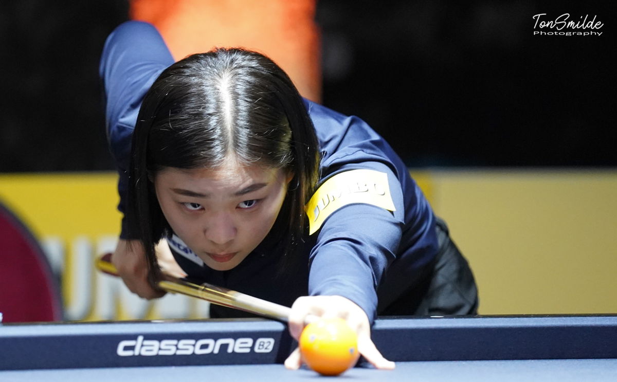 Jerry Hermans was the highest in average with 1.538 ahead of Belgian Stef van Hees with 1.276, another Belgian, Steven van Acker with 1.111, Dutchman Kay de Zwart with 1.090 and Frenchman Jérôme Barbeillon also 1.090. To finish the day: what keeps the ladies away from the World Cups? Ha Eun Kim is full of ambition, having already played the World Cups in Las Vegas, Ho Chi Minh and Porto this year, so now she starts far away in the Netherlands. And soon she can play the World Cup in Korea. How she pays for it as an 18-year-old student? ''I have a sponsor, 'Green', a frozen food company.'' In her first World Cups, she gathered six points, putting Hi eun in 382nd place in the world rankings.