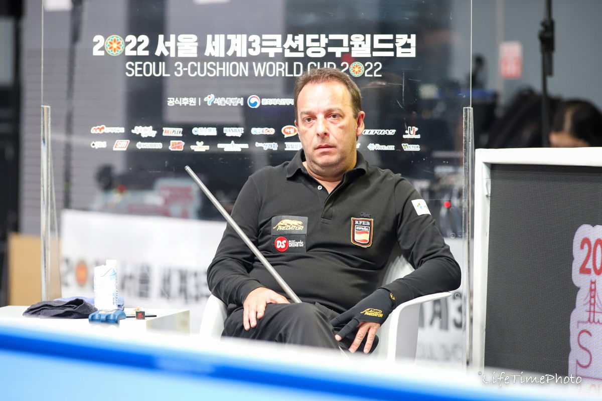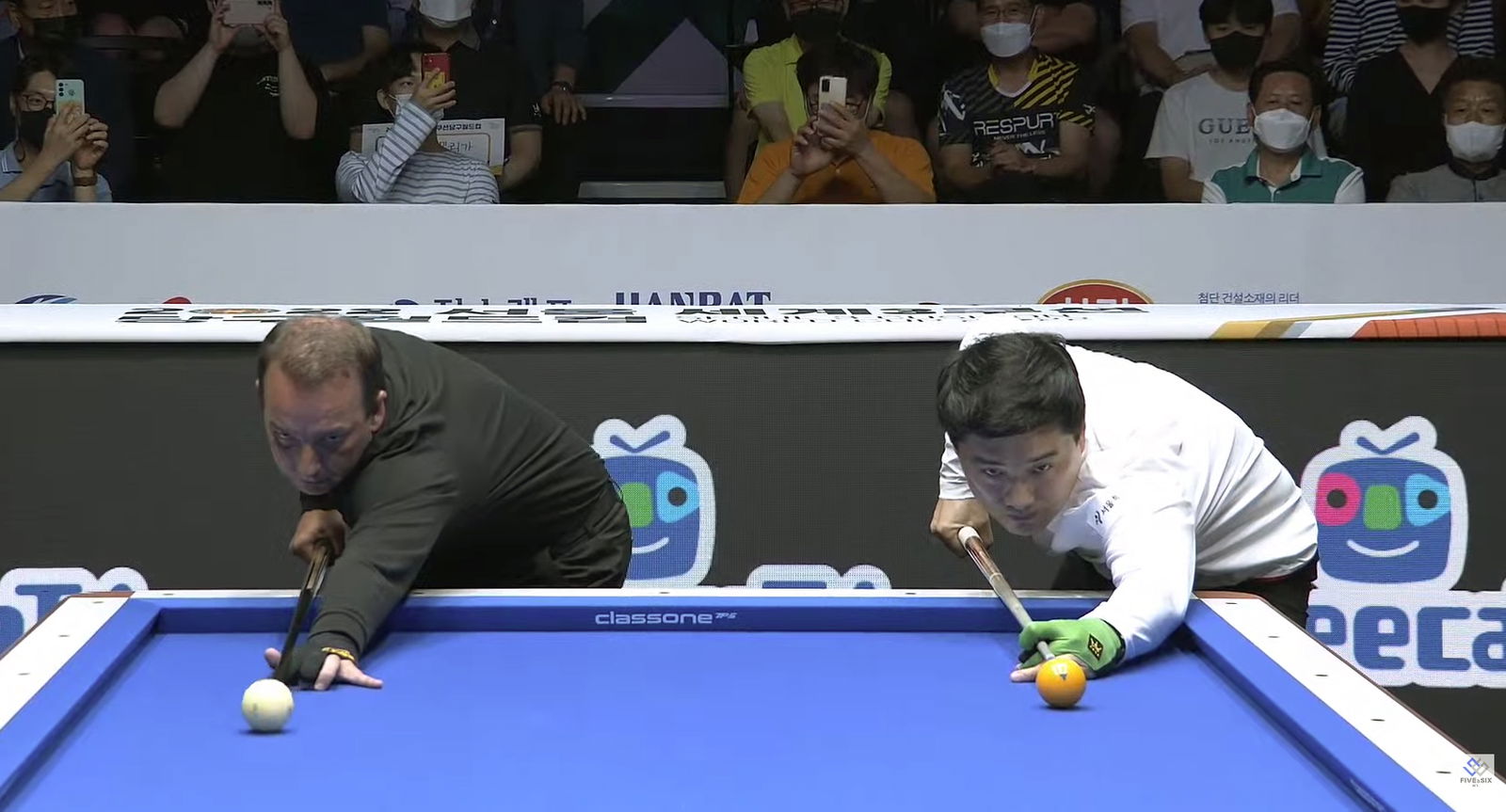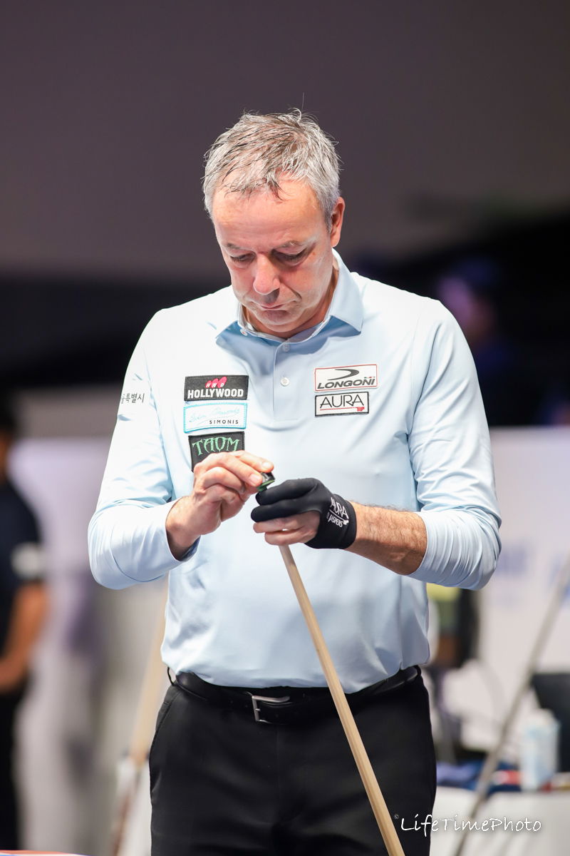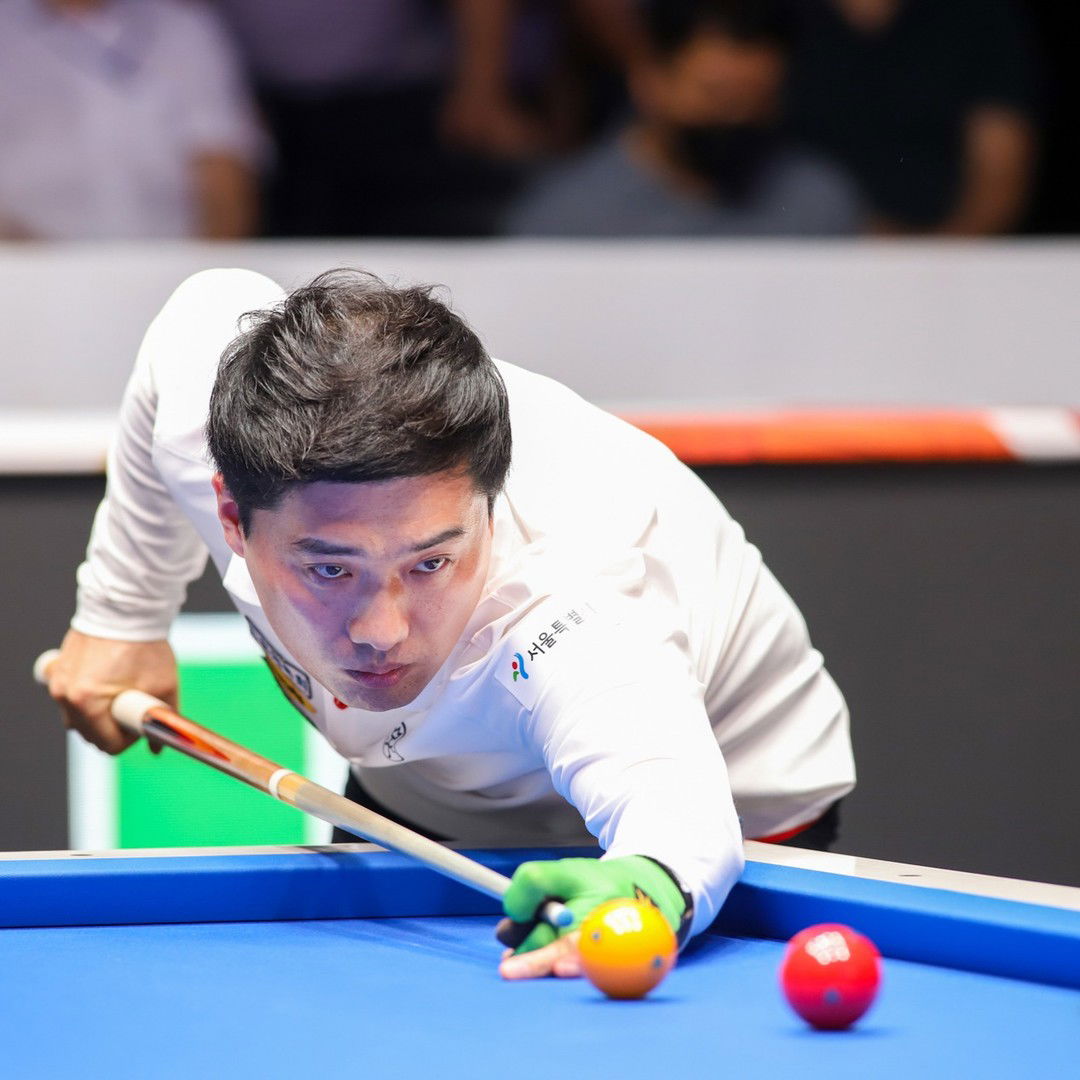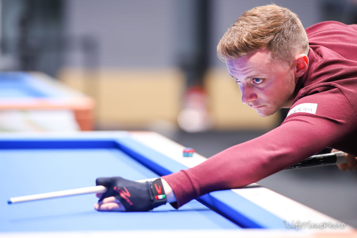 At the other table, in the match between the two outsiders Myeong Jong Cha and Gwendal Maréchal, the scenario was almost the same. The Frenchman had a promising start, breaking away in the fourth inning with a run of 10 to 17-3 and even taking a 28-11 lead. That was the signal for the Korean to fight his way back into the match. Cha, who is suddenly famous in his country, took some of the lead with a run of 9, gradually took over the initiative, but saw the French promise with a run of 8 in the 21st to get back to 48-47. Gwendal, who played a fantastic tournament and achieved his first major World Cup success, went down in the tension of the final innings. He missed four times in sight of victory, after which Myeong Jong Cha finished with 2 and 1, to the delight of the home crowd: 50-48 in 24.