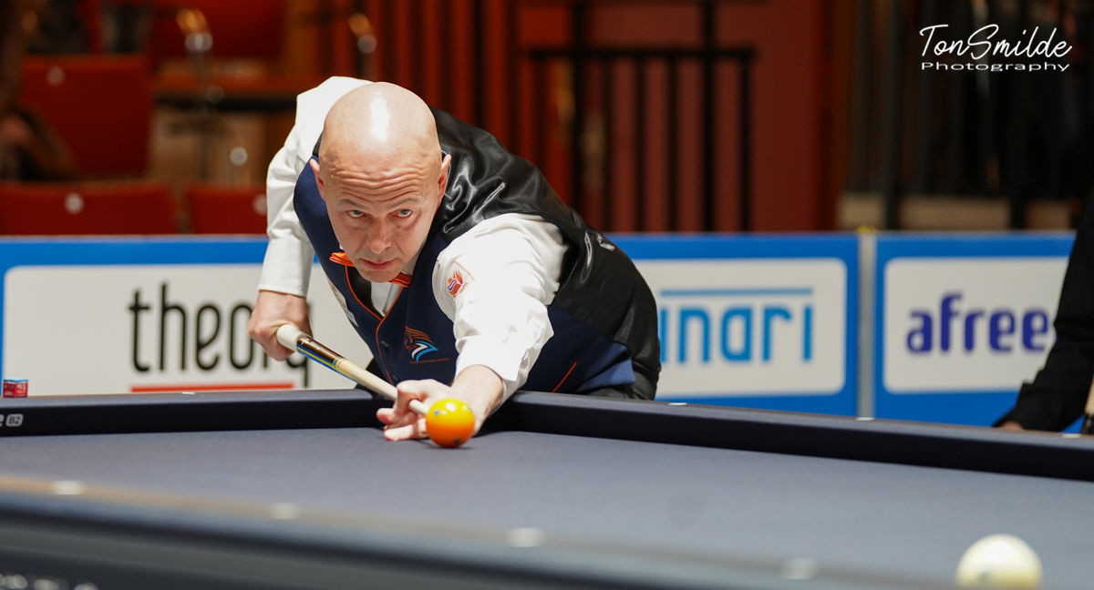 The Netherlands unexpectedly had big difficulties with France and still crawled through the eye of the needle. Dick Jaspers was trailing all game against Mikael Devogelaere, but showed his resilience and high class in the last inning, in which he went from 35-32 down with a run of eight through the finish. Devogelaere went from 40-35 to 40-36 (25 innings) in the equalizing inning. The other Frenchman, Jérôme Barbeillon, won against Jean Paul de Bruijn 40-35 in 32 innings.