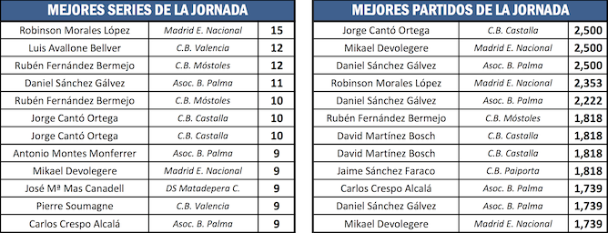 The clash of the day and of the weekend was the match between Castalla and Móstoles, Palma's pursuers and contenders for the title. The surprisingly generous win was for Castalla with good victories for David Martínez against Rubén Legazpi (40-35 in 22), Jorge Cantó against Adrián Legazpi in 24 innings, Jesús Rico against Alfonso Legazpi in 35 and finally Andrés Carrión against Rubén Fernández in 28 innings. The Madrid team is now in third place, three points behind Castalla and four behind Palma.
