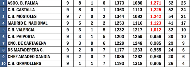 With the ninth round, the competition was halfway. Móstoles (2nd) and Castalla (3rd) want to try and oust Palma from the lead. But the islanders will not be intimidated by Valencia (2-6) and retain the leading position. Dani Sánchez, better every day, played a top match against Palazón in 16 innings (2,500).