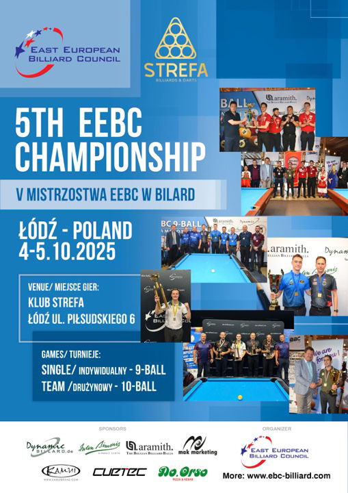 The fifth edition of the tournament will take place on October 4-5, 2025, at Europe's largest billiard club – Strefa Billiards and Darts in Łódź. The EEBC Championships began in 2021, when the first champion was crowned in Petrich, Bulgaria. The second competition was also held there, but subsequent tournaments have been hosted in Łódź. The fifth edition will be no different. The local Strefa Billiards and Darts offers excellent playing conditions and a great capacity for hosting tournaments.
