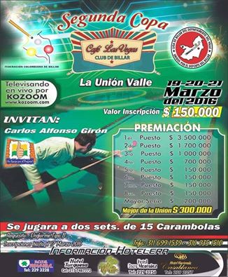 El año pasado Luis Martínez venció en la final al capitalino Andrés Lizarazo y terminó con 1.511 en la general del primer abierto de tres bandas celebrado en el Club Café Las Vegas de "La Unión", un municipio ubicado al norte del Valle del Cauca, a tan solo 8 horas de la capital colombiana por la vía que conduce al eje cafetero, exactamente a 60 minutos de la ciudad de Pereira.