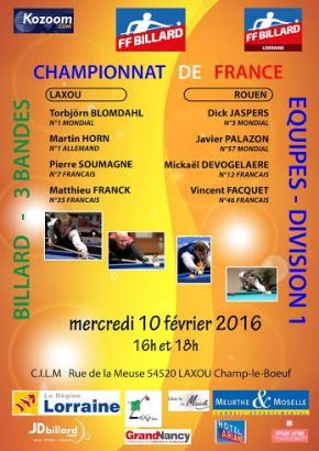 A las 16:00 horas de hoy miércoles se disputa una nueva jornada de la liga francesa por clubs a tres bandas en su primera división. A las 16:00 Laxou pretende vengar la afrenta de Rouen, mientras que Andernos recibe en casa a Gravelines.