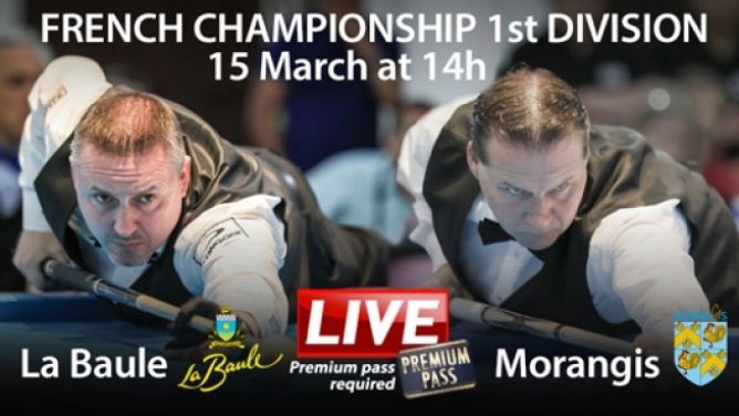 Mañana jueves 15 de marzo, en directo por Kozoom, el club La Baule liderado por el número uno del mundo y actual campeón mundial Frédéric Caudron recibirá el Cetsi Morangis liderado por el número dos del mundo y sub campeón mundial Eddy Merckx.