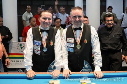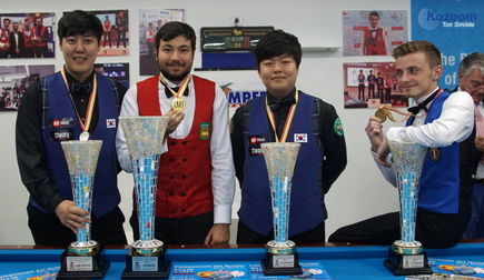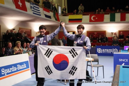 Dos estrellas del billar coreano estuvieron en la posición más alta después de la final para equipos nacionales. Sung-Won Choi, de 39 años, y Jae-Guen Kim, de 44, escribieron sus nombres en oro con el primer título mundial para un equipo coreano. La victoria sobre Bélgica en la final (40-34 en 24 entradas) fue transmitida en el bastión de billar asiático por el canal deportivo más grande del país y vista por más de 1,2 millones de personas. Los nuevos laureados mostraron su alegría después de la final. "Esta fue una de las misiones más importantes para nosotros, llevar el título mundial a nuestro país".