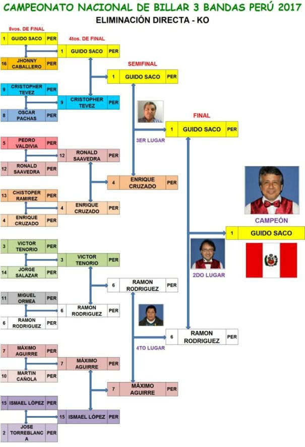 La primera fase rápidamente dejó a Saco como único líder de la competencia con 1.406 de general. El compañero de equipo de Ramón Rodríguez tomó el liderato del torneo desde la primera fase y durante todo el campeonato sus rivales solo pudieron deleitarse con el buen juego del experimentado Saco, quien a sus 50 años obtiene su cuarto título nacional. En la segunda fase 24 jugadores en ocho grupos buscaron el pase a los octavos de final, nuevamente Guido ratificó el liderato con 4 puntos de Match y 1.200 de general en la ronda.