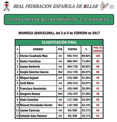 El III Gran Premio de Artístico congregó en Manresa durante el fin de semana a 12 jugadores de la modalidad de Artístico. Héctor Cuadrado resultó vencedor tras imponerse en la final a Xavier Fonellosa (3-2) en un choque intenso y muy reñido. Sergio Sánchez y Jaume Norberto acompañaron en el podio a los finalistas. Un póker de ases que deleitó a los aficionados y que fue superior al resto de competidores.