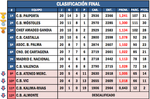 Se complicó la existencia en la penúltima sesión cuando perdió dos partidos consecutivos y la gran ventaja sobre sus más directos rivales. Sin embargo, Paiporta dependía de sí mismo para conquistar el título español de tres bandas por equipos y esta vez no falló. Mantenía un punto de ventaja sobre Móstoles y aguantó la presión venciendo primero a Vic (2-6) y más tarde a Madrid Escuela Nacional (0-8). Móstoles, mejor promedio de la Liga y equipo con mayor número de parciales quedó en segunda posición, mientras otro equipo valenciano, Chef Amadeo Gandía terminó tercero.