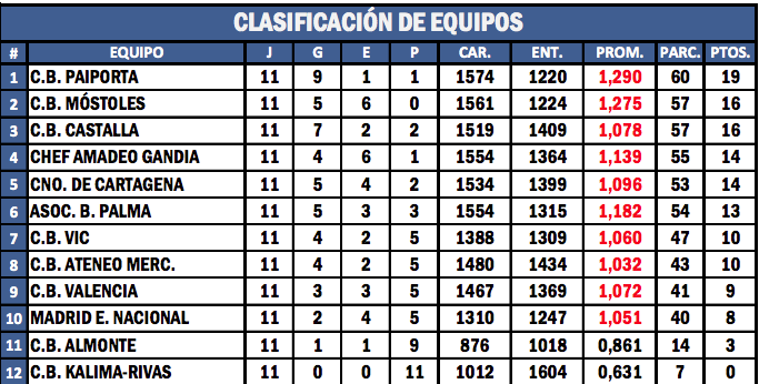 Dos jornadas, las 10ª y la 11ª se disputaron este fin de semana en tres sedes diferentes y con el líder, Paiporta, manteniendo su privilegiada posición consiguiendo dos nuevas victorias. Quien dio el salto desde el quinto puesto hasta la segunda plaza fue Móstoles. El cuarteto madrileño supera por promedio a Castalla, equipo que ostentaba dicha clasificación, pero un empate y una victoria no fueron suficiente para mantenerla. Gandía y Cartagena descienden un puesto, aunque la distancia con los líderes todavía es asumible.