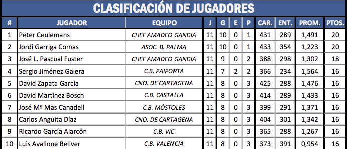 En el capítulo invidual destacó Sergio Jiménez, el número dos del equipo líder ganó sus dos partidos el 19 y 21 entradas (2,000). Xavier Yeste que reapareció a lo grande con Paiporta ganó en 19 y 24 entradas, Adrián Legazpi y Antonio Montes también ganaron uno de sus partidos en 19 entradas.