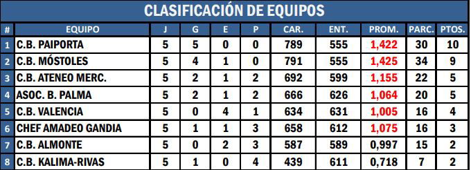 Paiporta aseguró su condición de líder venciendo 8-0 a Palma en un partido en el que los actuales campeones no pudieron contar con Dani Sánchez y Juan David Zapata, ambos en Korea en distintos torneos. El equipo local (1,667 de promedio) tuvo en Sergio Jiménez y en Jorge Cantó a sus mejores hombres (22 y 23 entradas), aunque Palazón (25) y Yeste (26) estuvieron también a gran altura. Carlos Crespo fue el mejor entre los isleños (1,360)