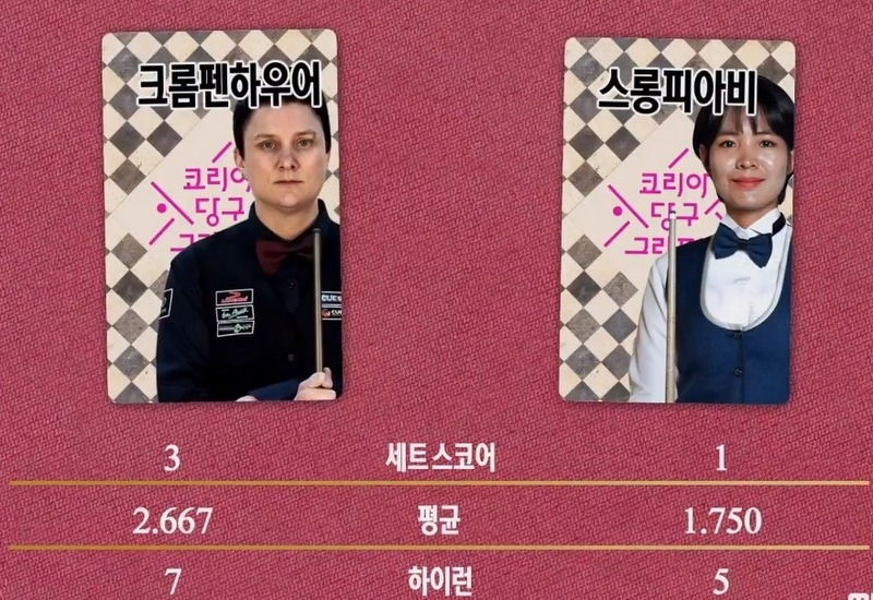 La número uno y dos en el ranking mundial de tres bandas para damas han mostrado una brillante promoción para el billar femenino en Seúl. Therese Klompenhouwer, la campeona mundial, y Sruong Pheavy, la número dos del mundo, jugaron un partido poco visto entre ellas en la arena del canal de televisión MBC. Therese ganó el partido a tres sets de 7 carambola 3-1, los promedios fueron extremadamente altos: 2.667 para la holandesa, 1.750 para la jugadora jugadora asiática. El último partido del Gran Premio con cinco damas, en el que Therese Klompenhouwer se mantuvo invicta y Sruong Pheavy terminó en el segundo lugar.