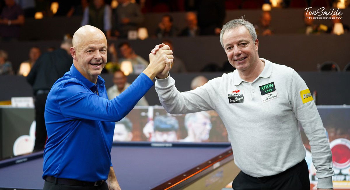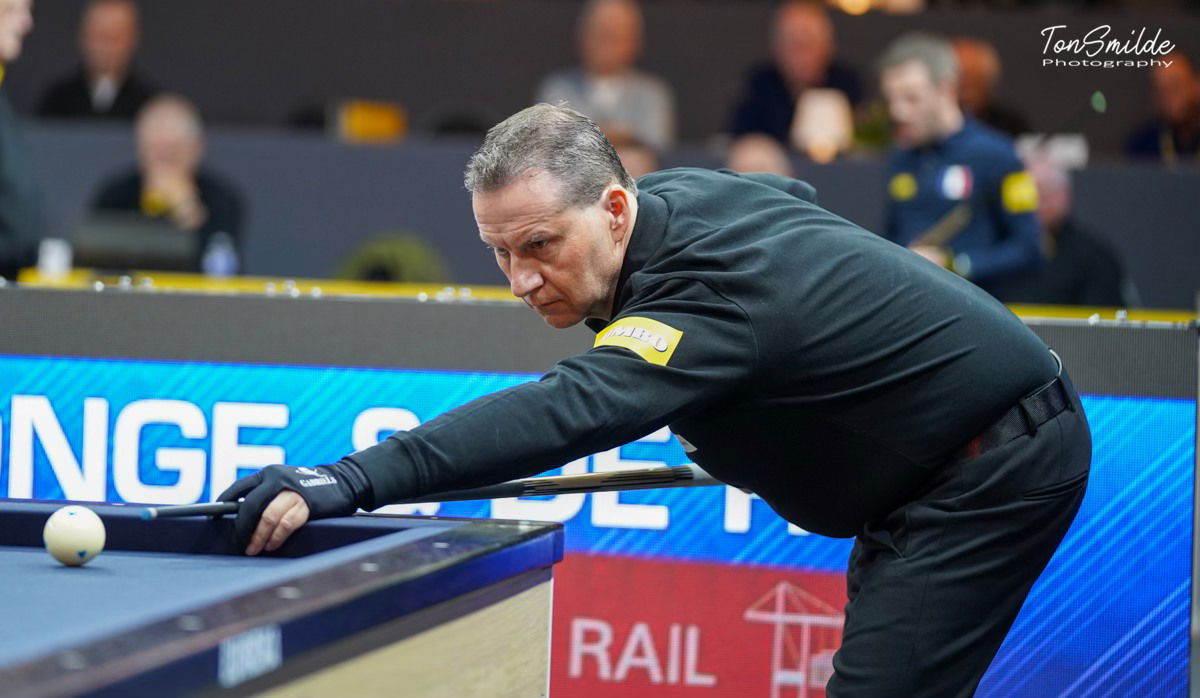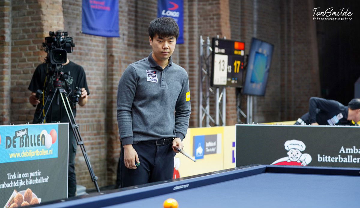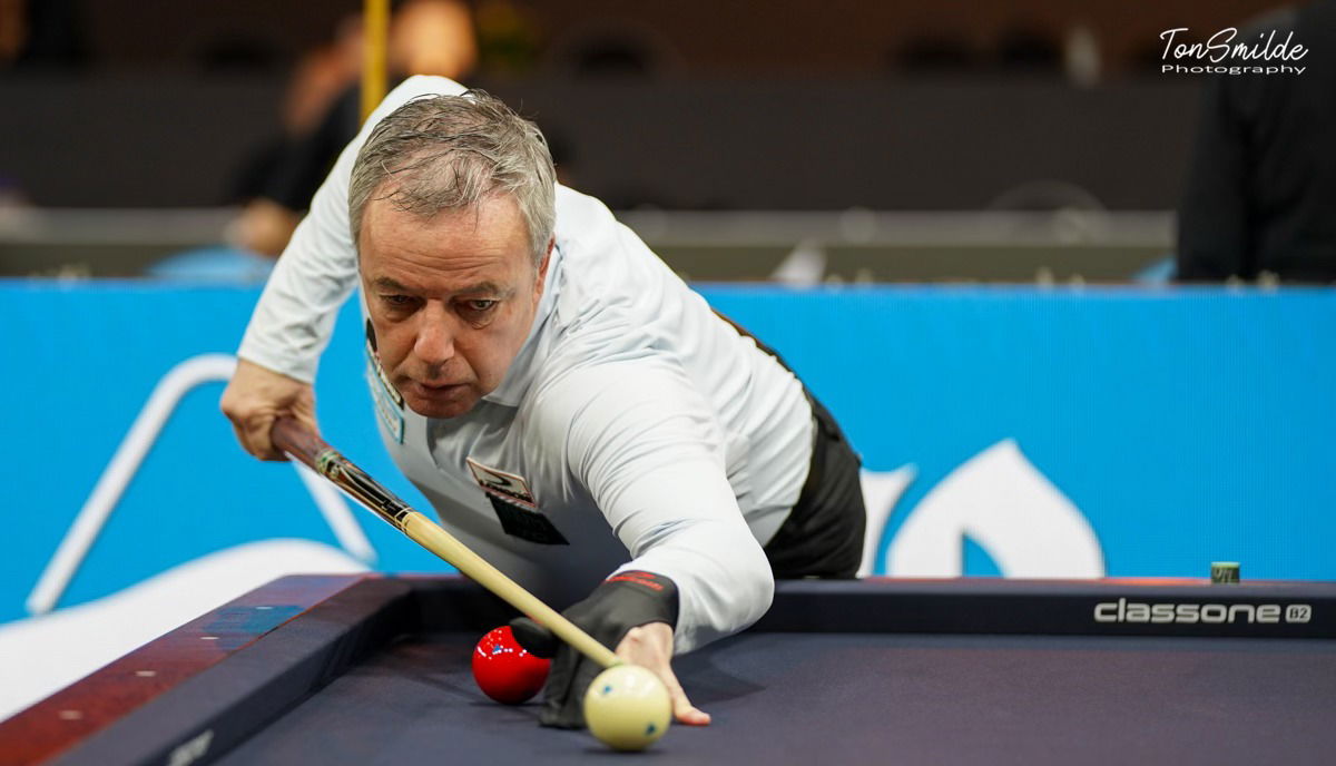 Dick Jaspers (N° 4 del mundo) tiene 5 victorias hasta ahora y un promedio general de 2.244. Hoy venció a Jun-tae Kim en los octavos de final con un marcador de 50-47 en 25 entradas, mientras que perdía 42-47 en la 24ª entrada. Jaspers fue llevado al límite y en el remate hizo lo posible por ganar, ocho en serie y el fin de su rival.