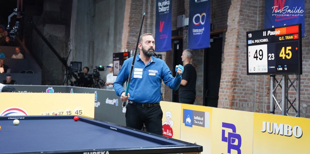El jugador griego realizó un excelente torneo con un promedio general en 5 partidos de 2.030 y la mejor serie del evento con 25 puntos. Al inicio de la jornada contra Tran Quyet Chien, Polychronopoulos lanzó una serie de 13 cuando la partida se encontraba igualada 36-36, ahora el griego esta cada día más cerca del Top 14.