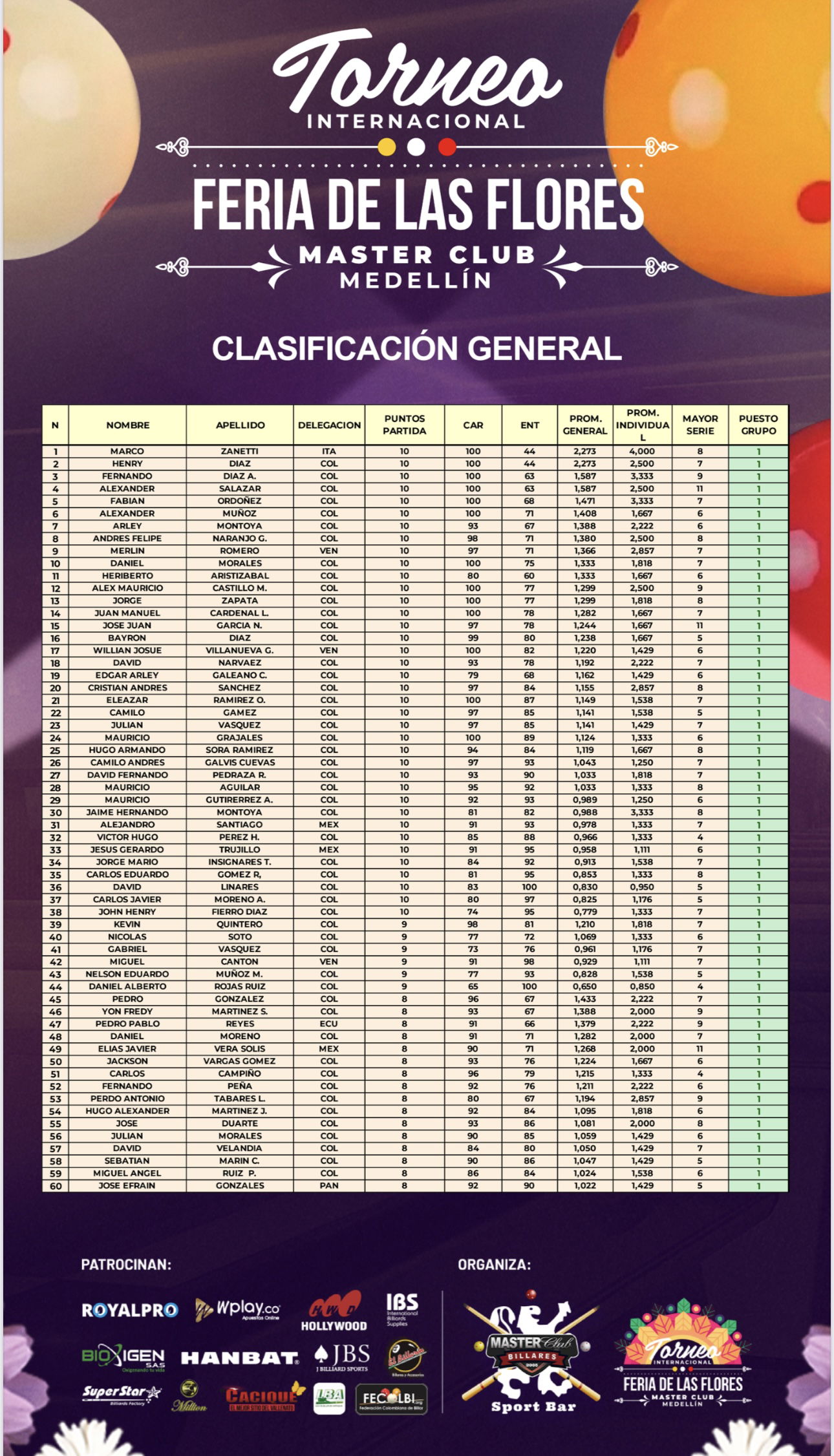 Medellín, Colombia – La fase de grupos del Torneo Internacional Feria de las Flores 2025 concluyó tras cuatro días intensos de competencia, con más de 450 jugadores divididos en 80 grupos. Lo que parecía una maratón de carambolas se convirtió en una exhibición de talento y estadísticas brillantes. Hoy comienza la ronda de 256, y la tensión ya se siente en el aire.