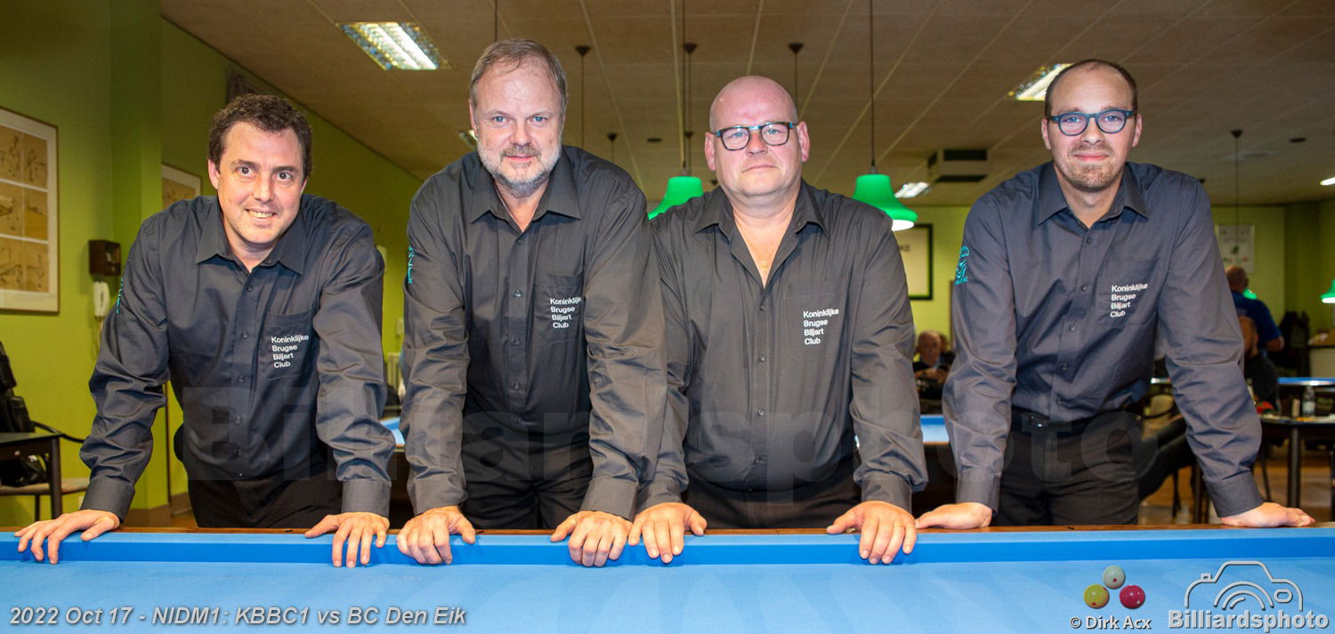 Biljartclub Den Eik mantuvo su liderazgo en la sexta ronda esta semana con una victoria por 6-2 en KBC Brugse, donde Eddy Merckx fue el mejor hombre en esta ronda con una victoria sobre Steven van Acker: 40-23 en 18. Dos equipos comparten el segundo lugar: Op de Meir, que empató contra Kortrijkse, y Mister 100, vencedor en el partido contra Billiard Promotion.