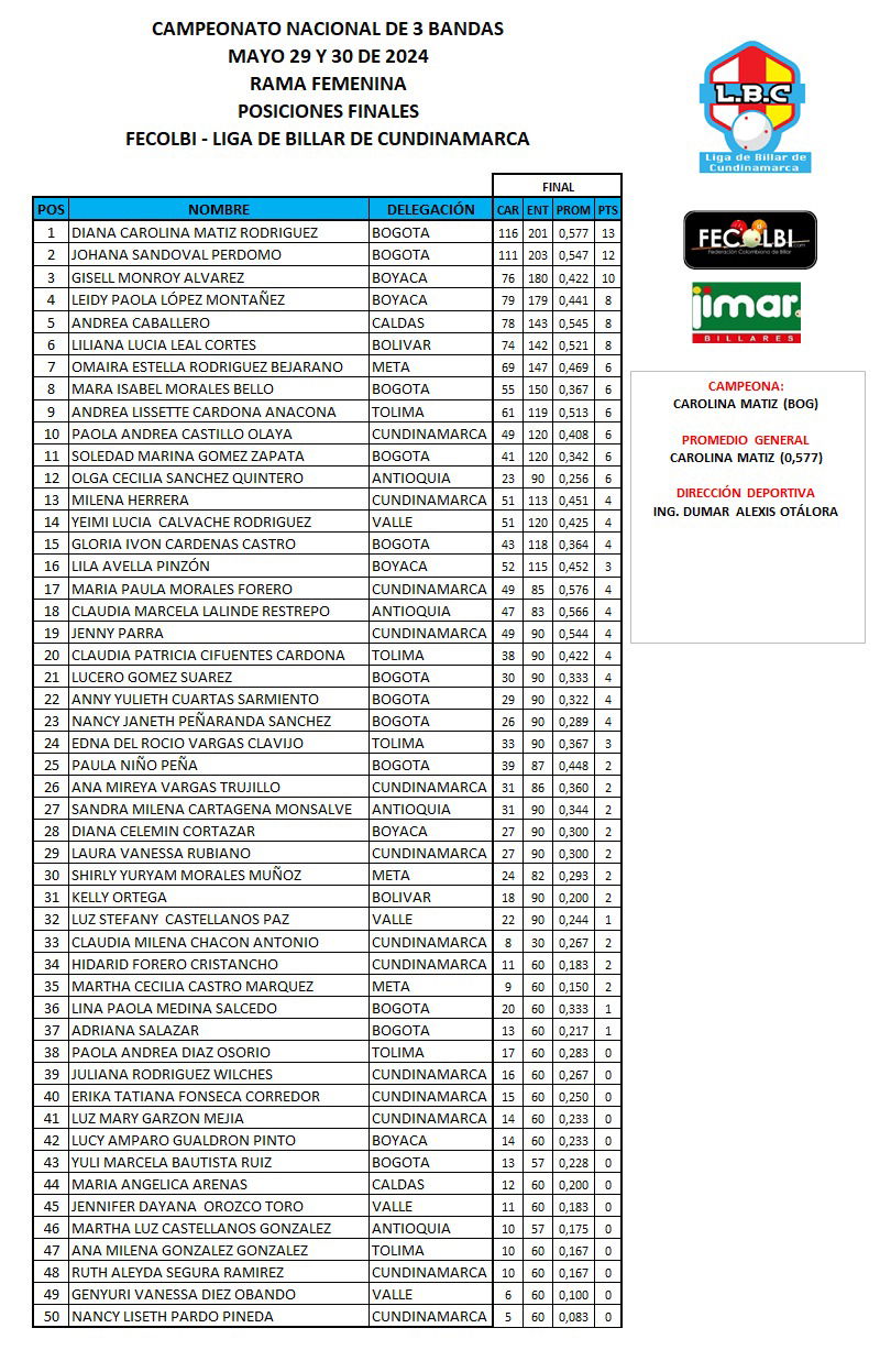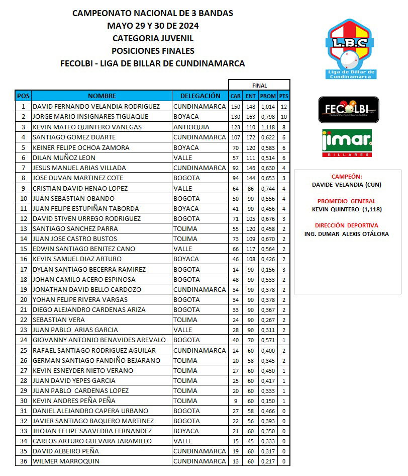 La jornada inaugural del campeonato comenzó con victorias significativas en las categorías juvenil y femenina. David Velandia se coronó campeón nacional en la categoría juvenil con un promedio general de 1.014, mientras que Carolina Matiz se impuso en la categoría femenina con un promedio de 0.577.