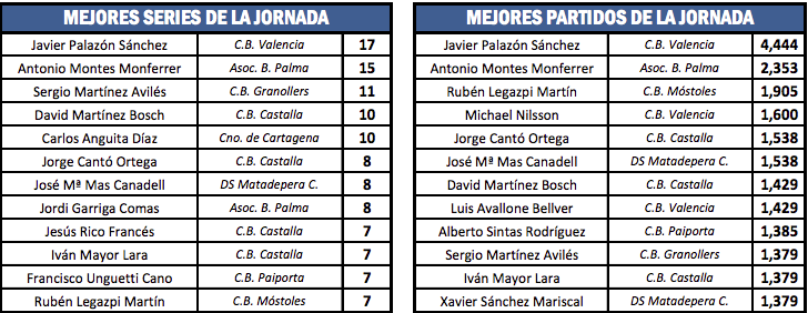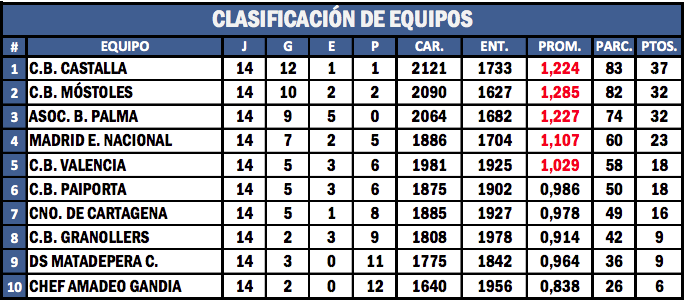 La victoria del líder ante Paiporta (8-0) y los empates de Palma y Móstoles, sus dos directos perseguidores, convierte a Castalla en un líder más sólido que aventaja a sus rivales en cinco puntos a solo cuatro jornadas para el desenlace final. La decimocuarta jornada tuvo como protagonista en el aspecto individual a Javier Palazón vencedor en uno de los partidos estrella de la jornada ante Robinson Morales en 9 entradas (4,444) con una serie de 17. En la parte baja, Valencia y Paiporta, empatados a 18 puntos y Cartagena con 16 luchan por evitar uno de los puestos que desembocan en el descenso a Primera división. Se presentan cuatro jornadas finales no aptas para cardiacos en ambos extremos de la tabla clasificatoria.