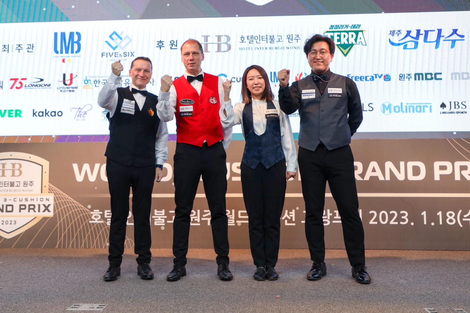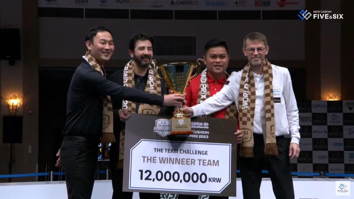 WONJU - Torbjörn Blomdahl y sus tres compañeros de equipo ganaron el primer premio en el evento Five&Six Grand Prix por equipos con cuatro jugadores. Derrotaron al cuarteto de Eddy Merckx 120-74 en 75 (1.578/0.986) en la final. Los ganadores fueron recompensados con 12 millones de won coreanos, es decir 9.000 euros, el finalista recibió 6.000 euros. Completando el podio están los equipos de Jun Tae Kim y Sameh Sidhom. El propio Torbjörn Blomdahl se mantuvo invicto durante todo el torneo con tres partidos ganados en las rondas preliminares, uno en los cuartos de final, una semifinal y el partido final, en el que venció a Eddy Merckx 41-18 en 16 en el partido de líderes de equipo (2.562 para Blomdahl, serie de 10). Además de Torbjörn Blomdahl, el equipo de ganadores estuvo integrado por un vietnamita (TTT Nguyen), un estadounidense (Pedro Piedrabuena) y un coreano (Wan Young Choi).