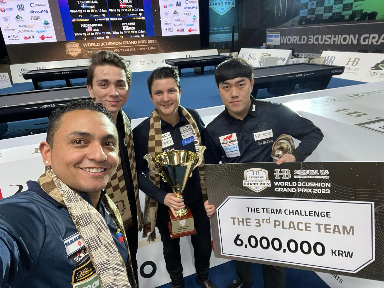 José Juan, Burak Hashas, Therese Klompenhouwer en el equipo de Jun Tae Kim en el World 3 Cushion Grand Prix 2023