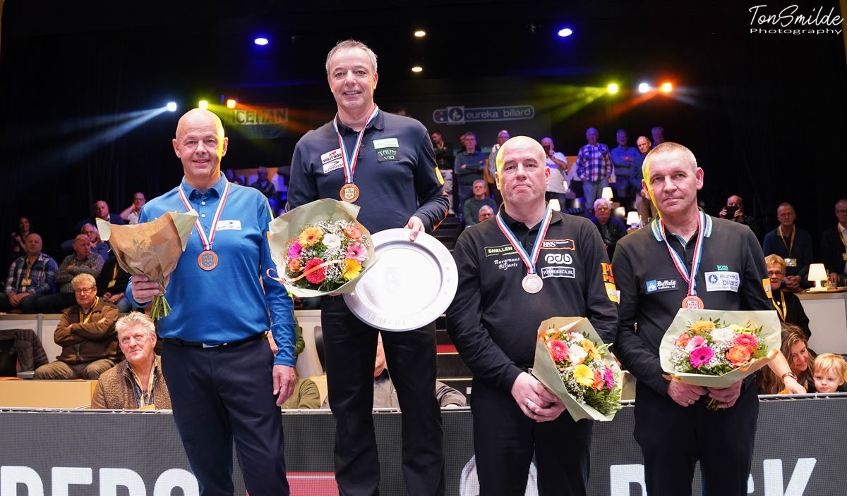 Los cuatro jugadores en la ceremonia de premios: Dick Jaspers, el ganador, Jean Paul de Bruijn, Barry van Beers y Raimond Burgman