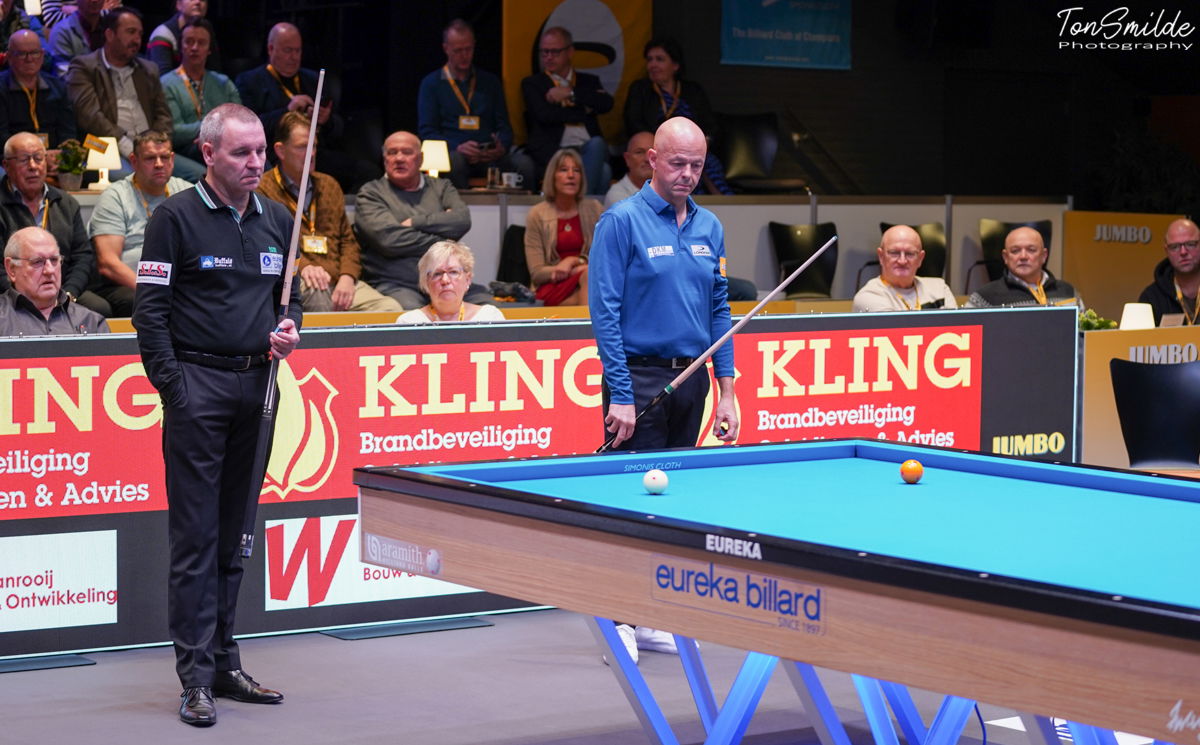 Las señales eran extremadamente favorables: los jugadores de Brabant, Dick Jaspers y Barry van Beers, se preparaban para una bonita batalla con dos jugadores en plena forma. La realidad, sin embargo, superó las predicciones. Dick Jaspers fue superior en todo el partido. Comenzó la batalla con una victoria de 10-8 en el primer set, ayudado por un tiro afortunado para la última carambola. Fue casi una demostración de gran clase de Jaspers. El marcador continuó con 10-8 en 3, 10-3 en 3 y 10-4 en 6. Y Jaspers se clasificó para una final contra Jean Paul de Bruijn como el año pasado.