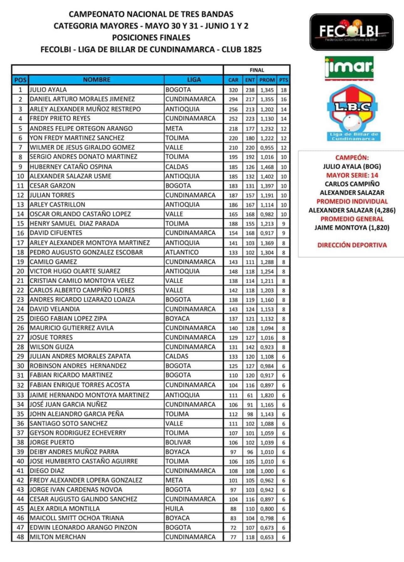 Durante seis días de competencia dos de ellos dedicados a las damas y juveniles y cuatro para la categoría mayores, se conocieron los tres nuevos campeones nacionales del 2024 en la modalidad tres bandas de Colombia que representarán al país en el próximo campeonato panamericano en Quilmes - Argentina. Carolina Matiz (0.577) ganó en Damas, David Velandia (1.014) en juveniles y Julio Ayala en mayores con 1.345.