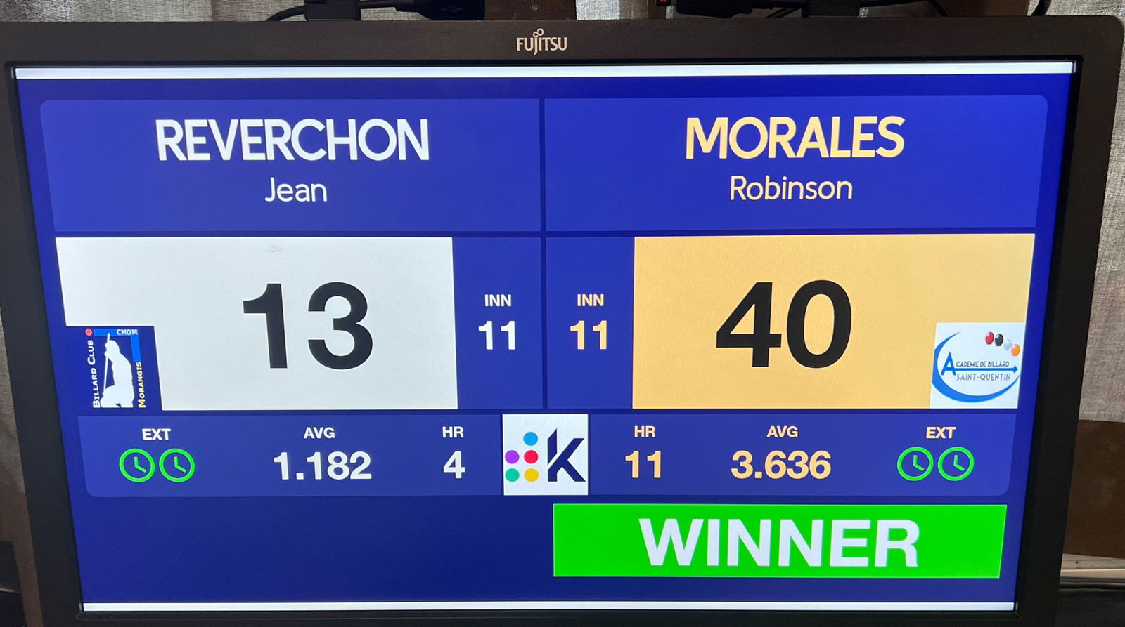 El líder del grupo, Saint-Quentin, consolidó su lugar al ganar los 4 partidos contra Morangis, con un partido excepcional de su líder Robinson Morales. El jugador de origen colombiano superó 40-13 a Jean Reverchon en 11 (3.636) y mantuvo su excelente desempeño colectivo. Johan Loncelle, Kevin Perrotin y Tangui Duriez sellaron la excelente temporada del club al vencer a Thomas Le Coat, Marc Vicari y Pierre-Yves Morel en 29, 61 y 53 entradas. Saint-Quentin jugó un promedio de 1.038, Morangis promedió 0.766.