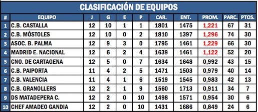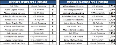 Nueva exhibición de Móstoles (1,576 de equipo) ante Escuela Nacional que no pudo contar esta vez con Robinson Morales. Valentín junior logró la única victoria forastera ante Adrián Legazpi, pero Rubén Legazpi (20 entradas), Rubén Fernández (25) y, sobre todo Alfonso Legazpi (17 entradas, el mejor jugador de la jornada) acercan a un solo punto al equipo mostoleño del liderato.