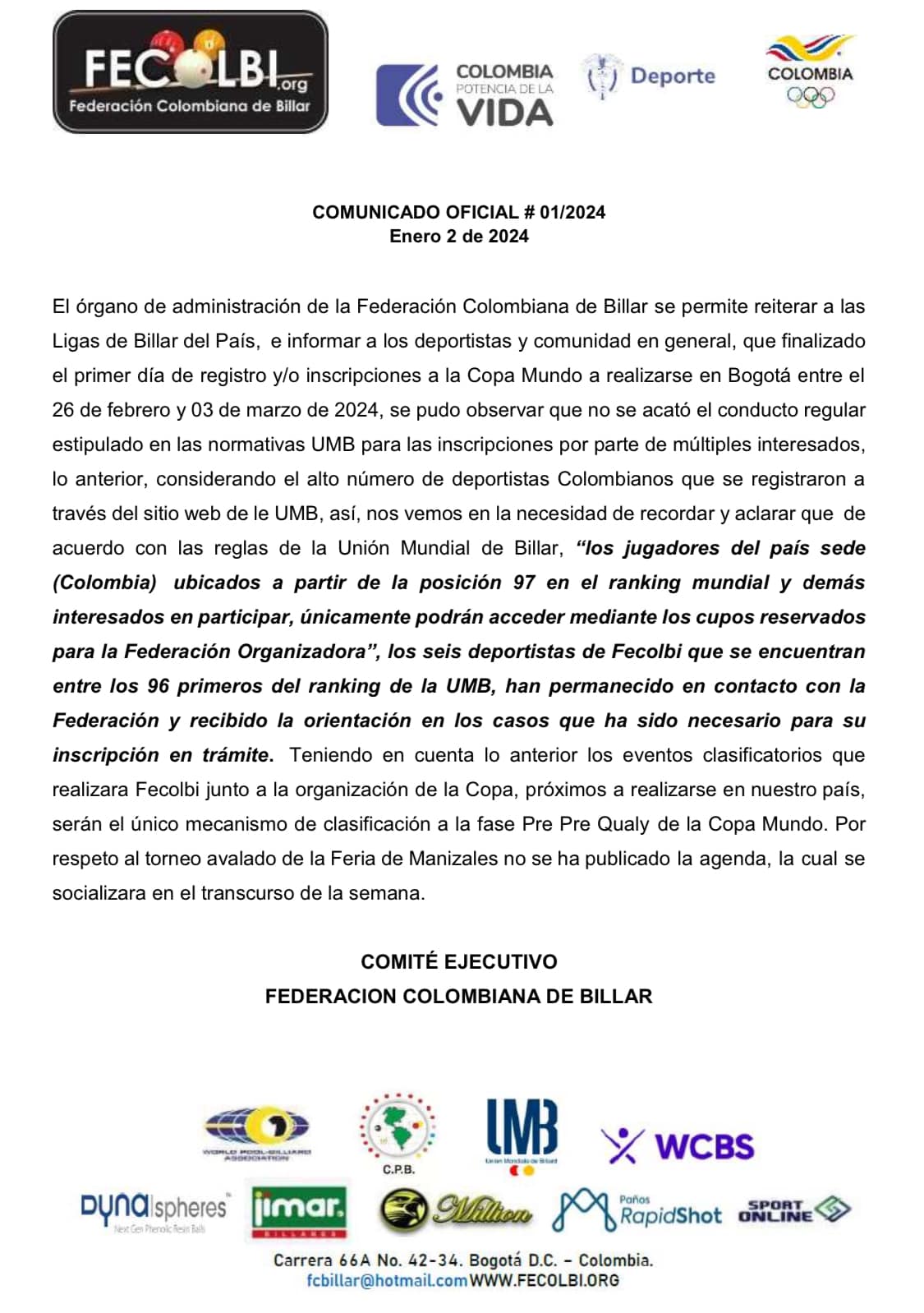 En la lista de reservas, figuran nombres conocidos como Luis Aveiga y Carlos Crespo. La federación colombiana de billar tiene reservados 20 cupos y en un comunicado oficial anuncia muy pronto el valor de la boletería para los asistentes y los clasificatorios para los cupos en reserva.