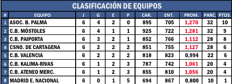 El duelo más importante de la sexta jornada se disputó en Palma entre el conjunto local y el Paiporta. Ambos equipos, igualados en la tabla clasificatoria en la primera plaza tanto en puntos como en parciales, iban a dirimir su supremacía, al menos en la primera vuelta en la competición más importante del billar español por clubs. Fue el equipo local quien salió victorioso (6-2), con el mejor promedio de equipo de la jornada (1,358) y con la sensación de que este año el título está más cerca.