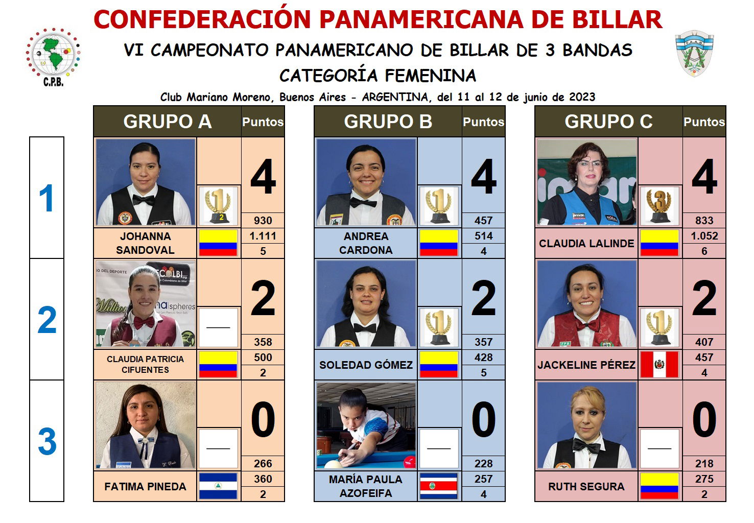 Las damas también compitieron en su VI versión panamericana. El continente está dominado por Colombia, pero sufre ausencia de jugadoras en la modalidad de tres bandas. Se espera que Colombia domine el podium en el último día con la campeona defensora, Johana Sandoval.