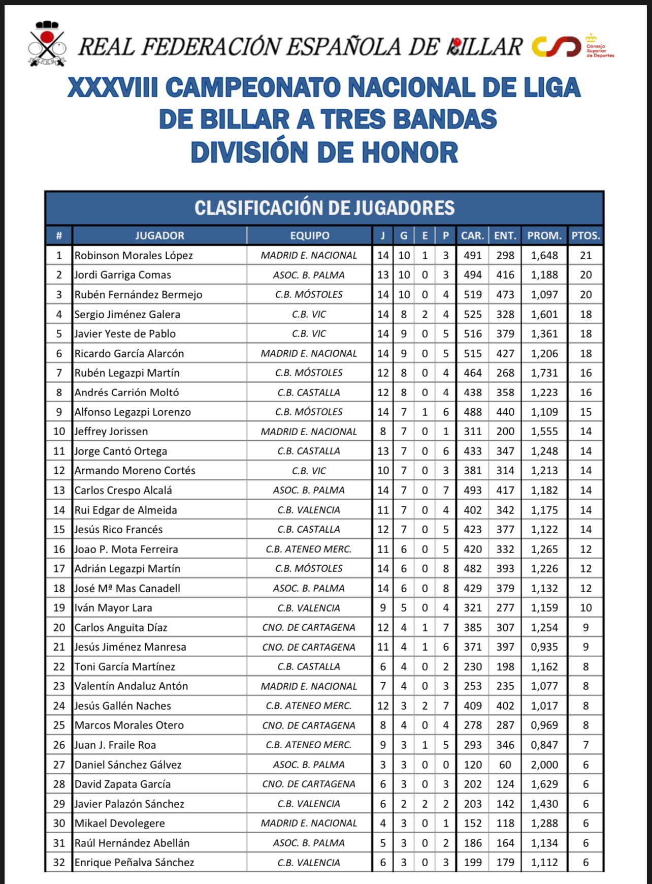 Robinson Morales ganó el sábado en el partido más importante contra el Palma jugando contra José María Mas 40-21 en 23 con una soberbia serie de 21, Jeffrey Jorissen venció a Carlos Crespo 40-19 en 26, Ricardo García perdió ante Jordi Garriga 40-28 en 30 y Valentín Andaluz venció a Raúl Hernández 40-30 en 35. El domingo contra el Valencia, Madrid vio la victoria 8-0 con victorias de Morales en 21 entradas, Jorissen en 42, García en 40 y Andaluz en 35 entradas. Palma cerró la liga con un empate 4-4 ante el Móstoles.