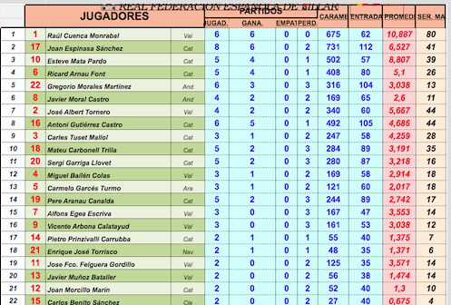 El gran jugador valenciano sigue imponiendo su ley en los juegos clásicos en España en los últimos años. Este fin de semana volvió a colgarse otra medalla de Oro, en esta ocasión, en el campeonato de España a la Banda disputado en la localidad valenciana de Paiporta, la séptima que consigue en la modalidad. Raúl Cuenca se impuso en la final a Joan Espinasa: (125-55 en 9 entradas). Antes en semifinales derrotó al catalán Ricard Arnau en el mejor partido del campeón (125-20 en 4 entradas).