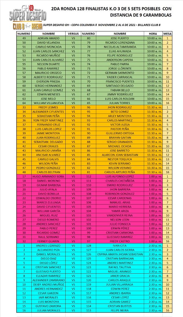 En el cuarto día del GH Colombia el formato de juego disminuye en carambolas y aumenta en sets. La primera fase empezó con 164 participantes en grupos de cuatro jugadores, las partidas se jugaron a 3 sets de 12 puntos. Para hoy la distancia de juego será a sólo 9 carambolas por set y la partida se jugará al ganador de 5 sets posibles.