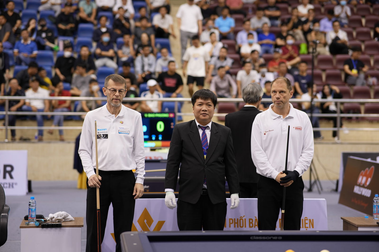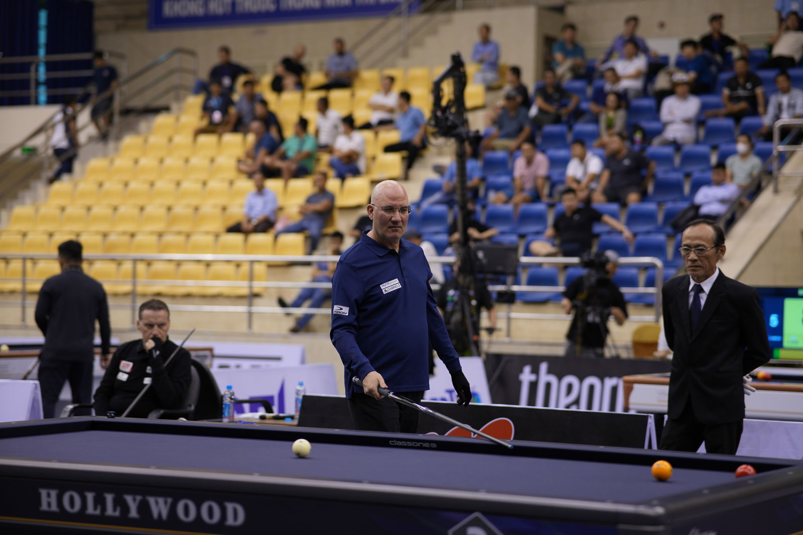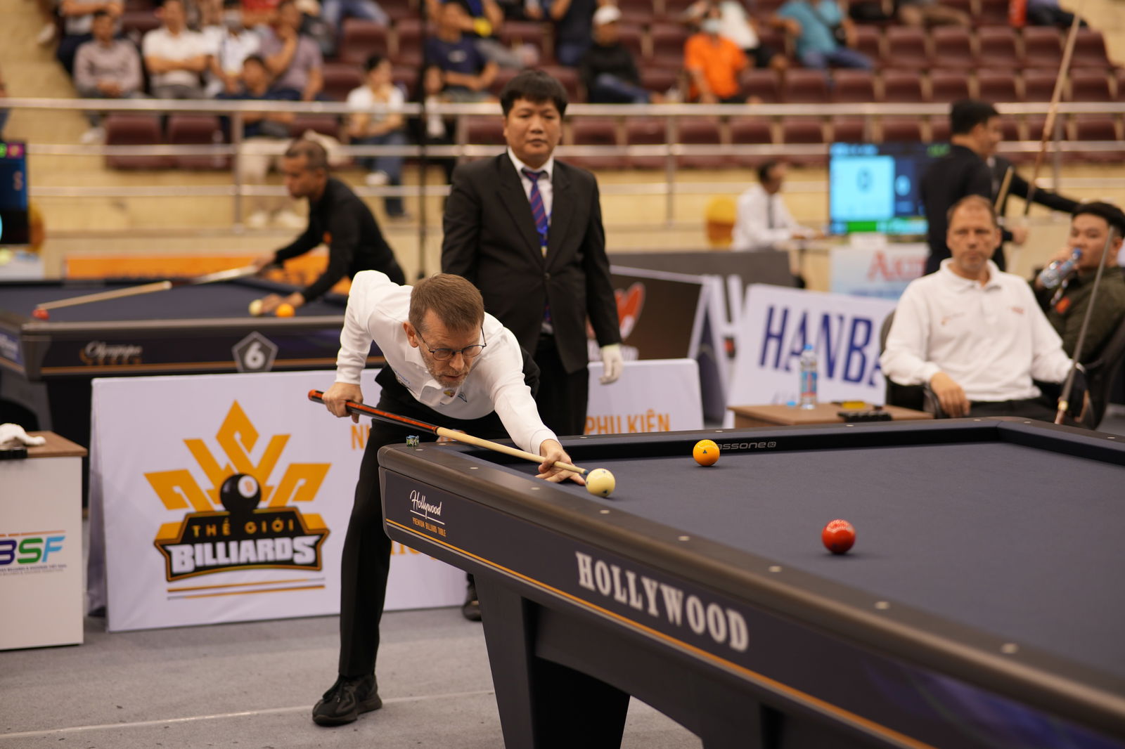 HO CHI MINH - El maestro en las primeras horas de la Copa del Mundo de Ho Chi Minh tuvo un comienzo espectacular. Torbjörn Blomdahl, de 60 años, abrió su misión en suelo vietnamita con una serie fenomenal de 26 puntos contra Dion Nelin. El duro golpe propinado a Nelin en la primera entrada, estuvo muy cerca de atacar el récord mundial de 28 carambolas obtenido por cuatro jugadores hasta el momento (Komori, Ceulemans, Caudron y Forthomme). Lo más destacado de este primer día en el cuadro principal puso inmediatamente al sueco en el papel como uno de los grandes adversarios para esta Copa. Blomdahl estuvo a tres carambolas del récord absoluto y del súper premio de 29.000 euros que entrega la UMB al jugador que supere el récord mundial. Otros jugadores destacados de este primer día incluyeron a Robinson Morales, el colombo español, venció al joven coreano Myung Woo Cho en un remate de partida 40-35 en 17 entradas y fue uno de los jugadores jugadores del día con un máximo de seis puntos de partido. La misma puntuación tambien la obtuvo Torbjörn Blomdahl (6-2.448-26), Tayfun Tasdemir (6-2.105-13), Robinson Morales (6-2.033-14), Sameh Sidhom (6-1.714-8) y Jun Tae Kim (6- 1,621-8). El mejor jugador en promedio fue Quyet Chien Tran, segundo en el grupo después de Blomdahl, con 2.609.