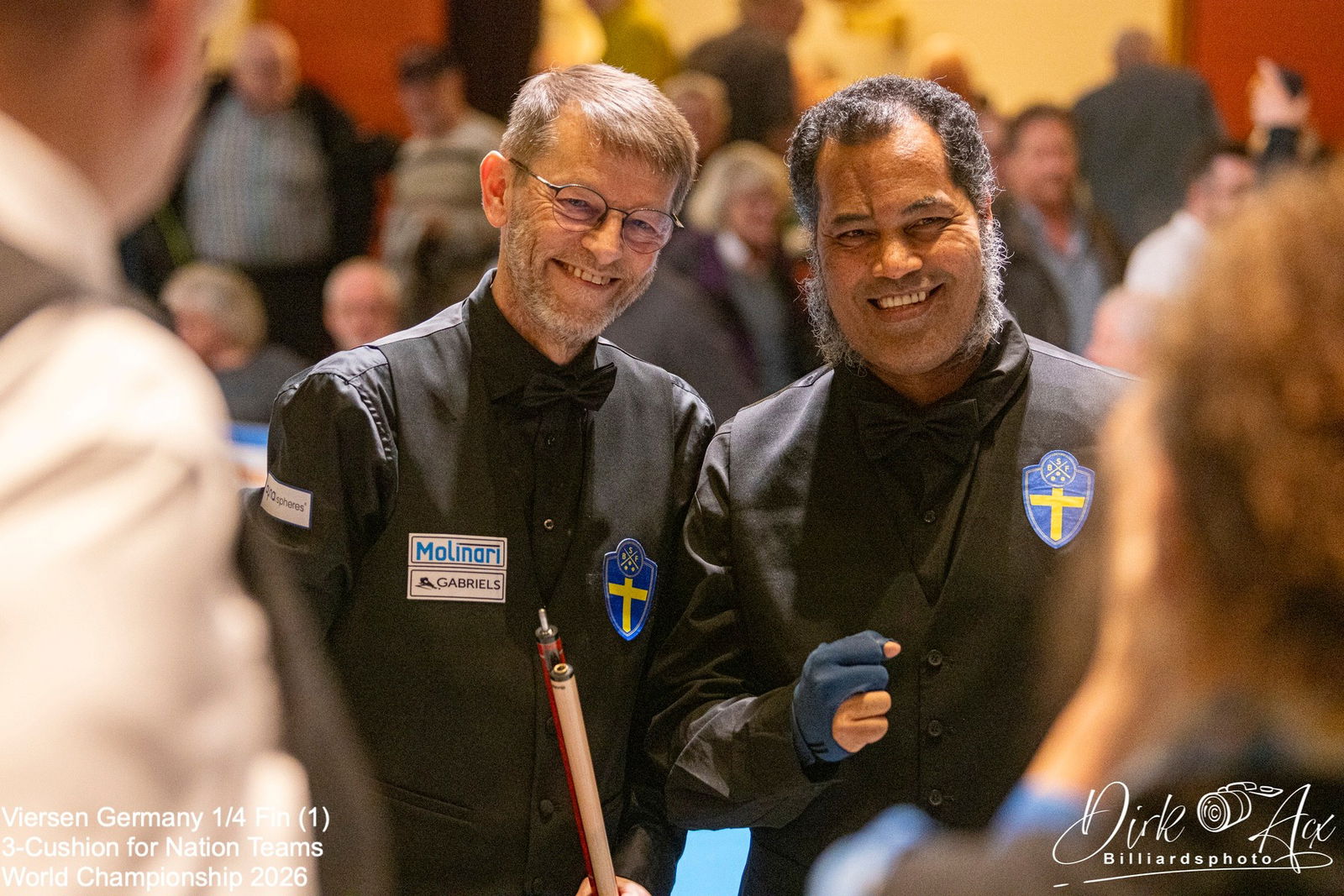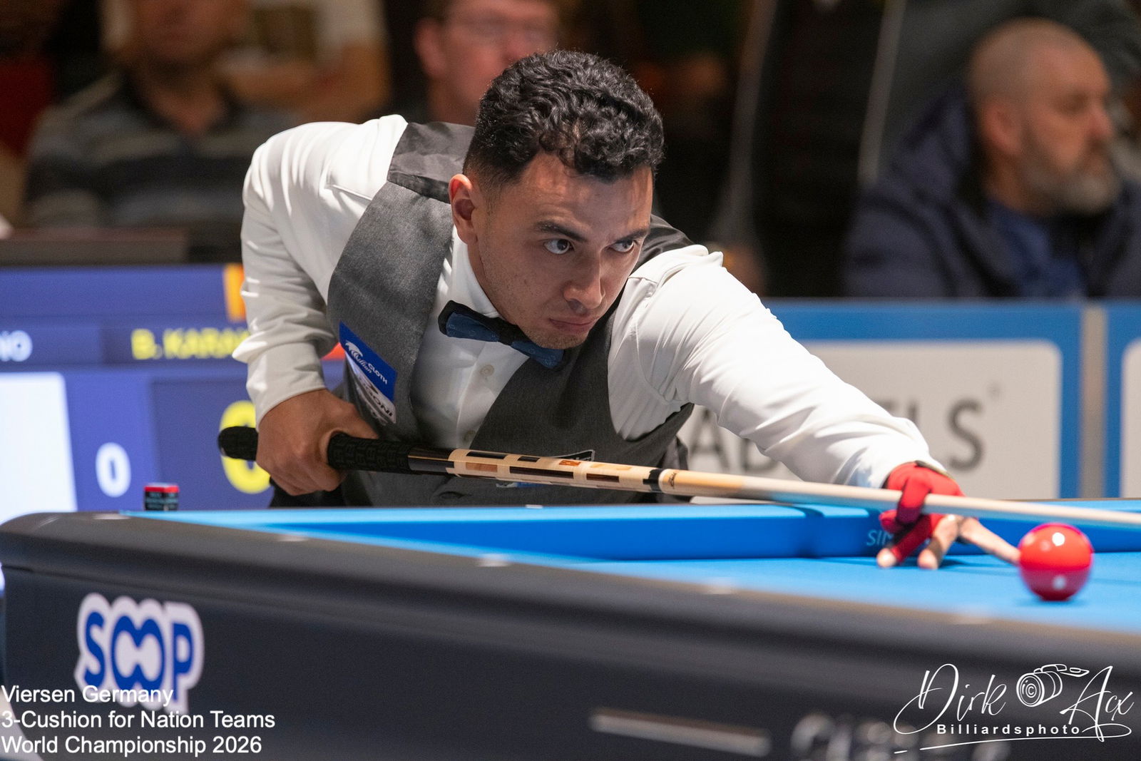 VIERSEN – La noche del sábado en el World Three-Cushion Team Championship terminó con un espectáculo vibrante en un coliseo totalmente lleno. Fueron necesarios tres tacadas alternas (una especie de desempate a muerte súbita) para definir los cuatro finalistas.