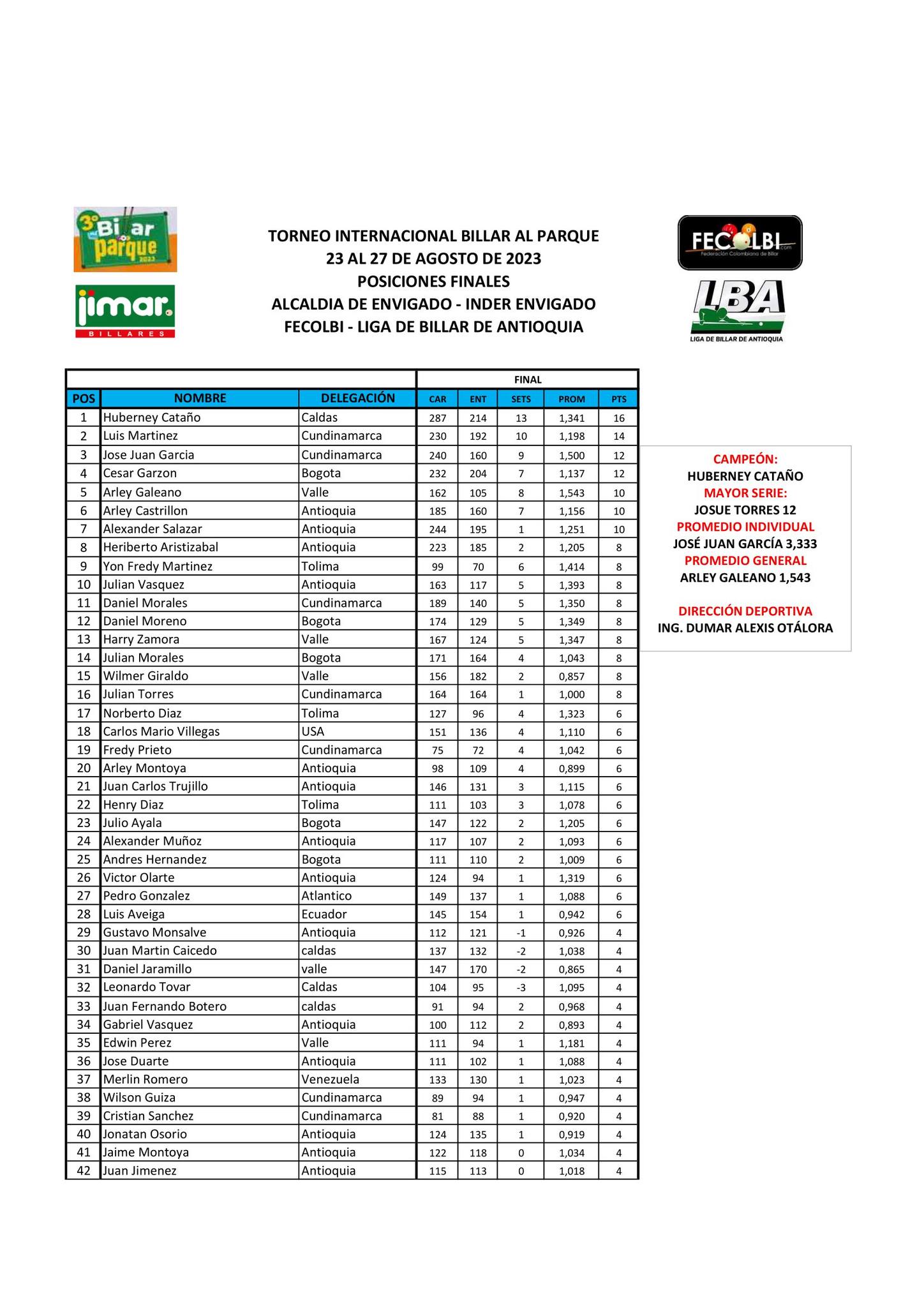 El ganador brilló en esta tercera edición, terminando con un promedio general de 1.341. Su hazaña le valió un gran premio de 28 millones de pesos colombianos, equivalente a unos 6.800 dólares americanos. Luis Martinez, no menos impresionante, registró un promedio de 1.198, mientras que José Juan aseguró el tercer lugar con un promedio de 1.500. Cesar Garzón se quedó en el cuarto lugar con un promedio de 1.137.